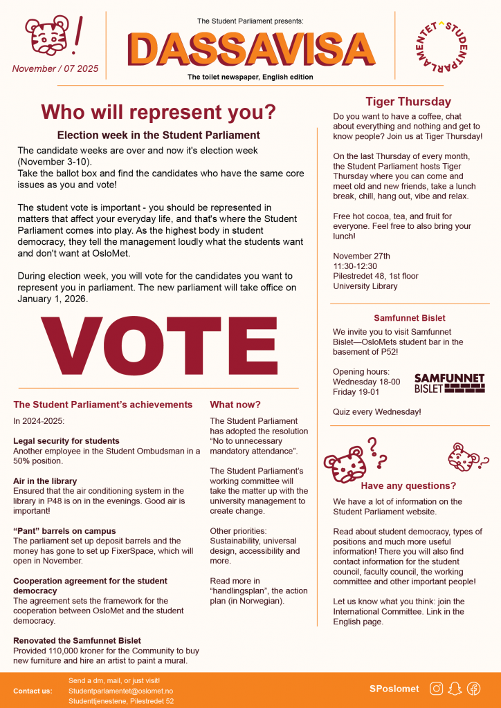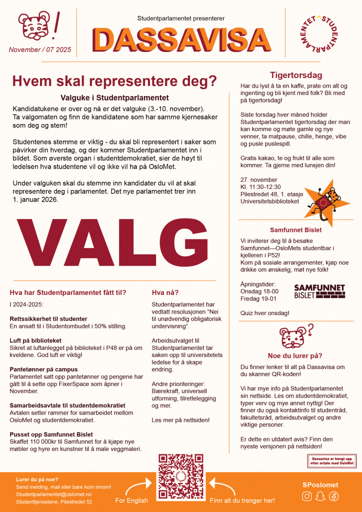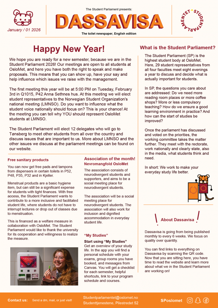 Ønsker du å få noe på dassavisa? Her kan du lese mer om rutiner for oppheng, innhold og forespørsler, eller send en forespørsel til studentparlamentet@oslomet.no.