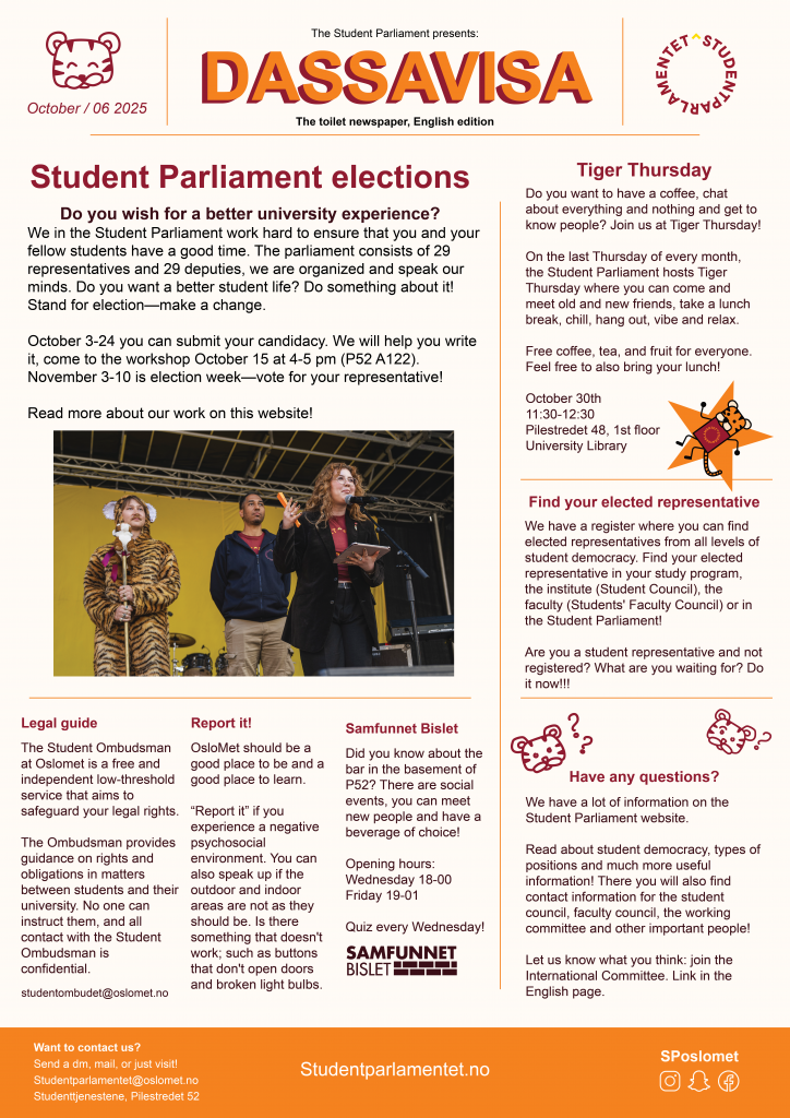 Vi i Studentparlamentet har vår egen avis der vi informerer om hva som skjer på campus, gir tips til studenter, og oppdaterer om studentdemokratiet. Nedenfor finner du lenker til tingene som står på dassavisa.