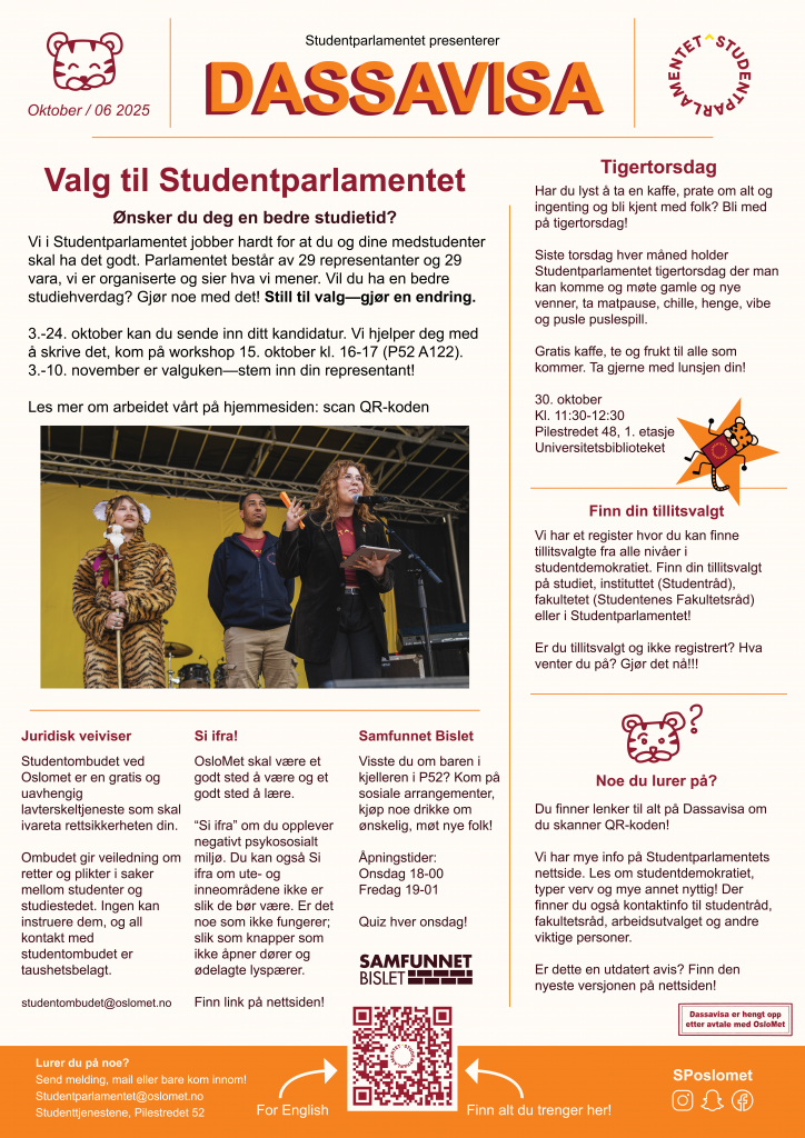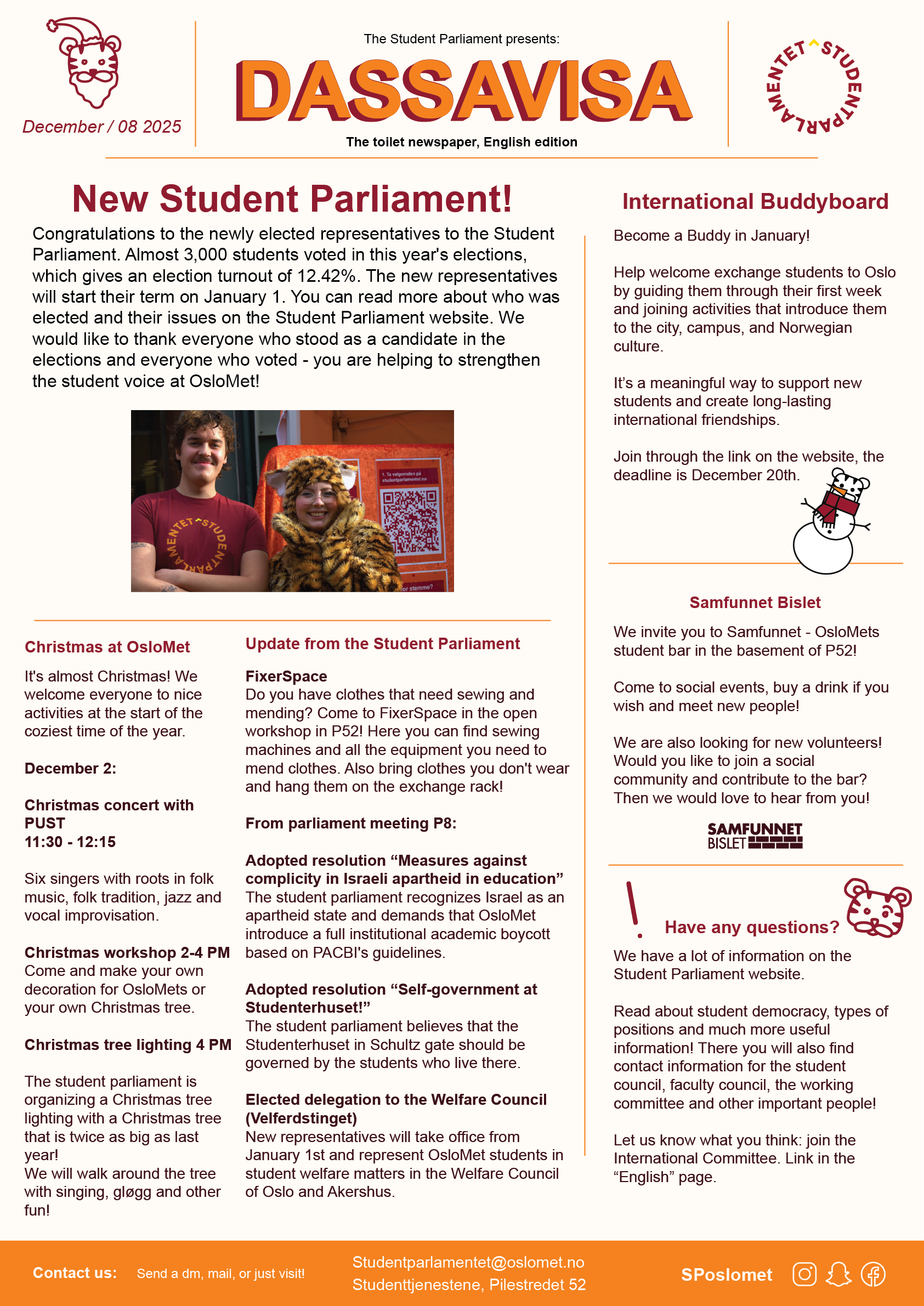 Ønsker du å få noe på dassavisa? Her kan du lese mer om rutiner for oppheng, innhold og forespørsler, eller send en forespørsel til studentparlamentet@oslomet.no.