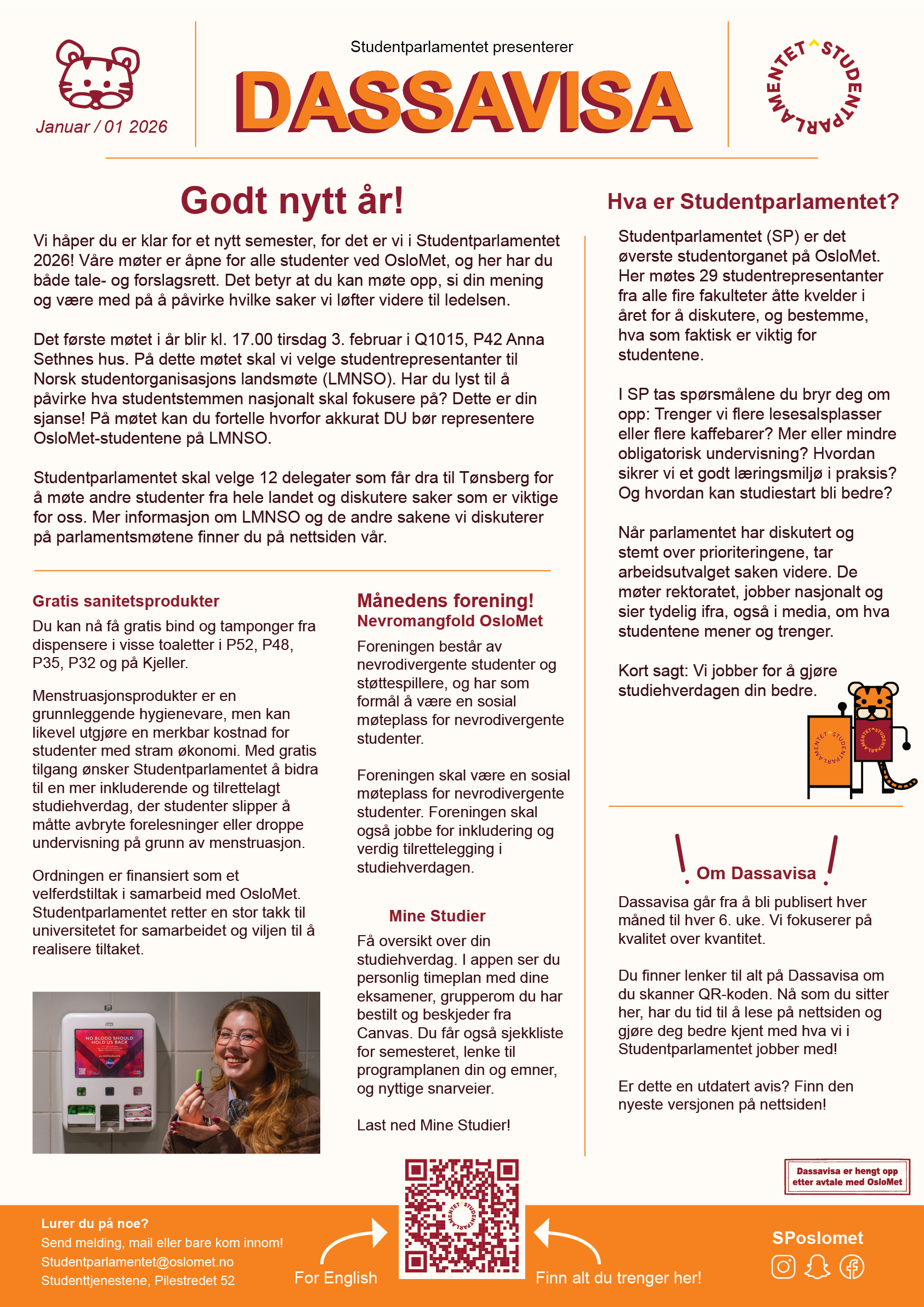 Vi i Studentparlamentet har vår egen avis der vi informerer om hva som skjer på campus, gir tips til studenter, og oppdaterer om studentdemokratiet. Nedenfor finner du lenker knyttet til sakene fra dassavisa.